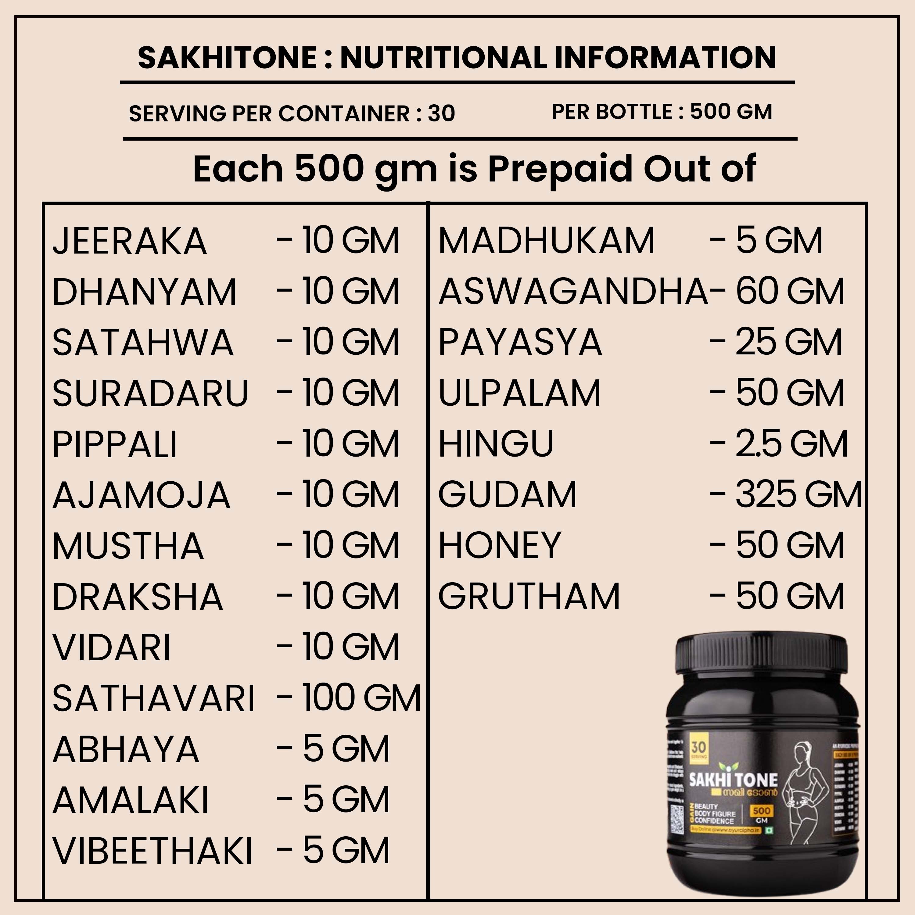 Sakhi Tone’s natural herbal blend is specifically formulated to support women's health, promote hormonal balance, and facilitate healthy weight gain. It features a variety of powerful herbs, including Jeeraka (Cumin), Dhanyam (Coriander), Satahwa (Dill), and more, which work together to enhance digestion, metabolism, and overall well-being.