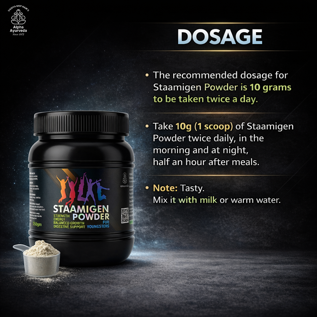 - Dosage: Take 10g (1 scoop) of Staamigen twice daily, in the morning and at night, half an hour after meals.